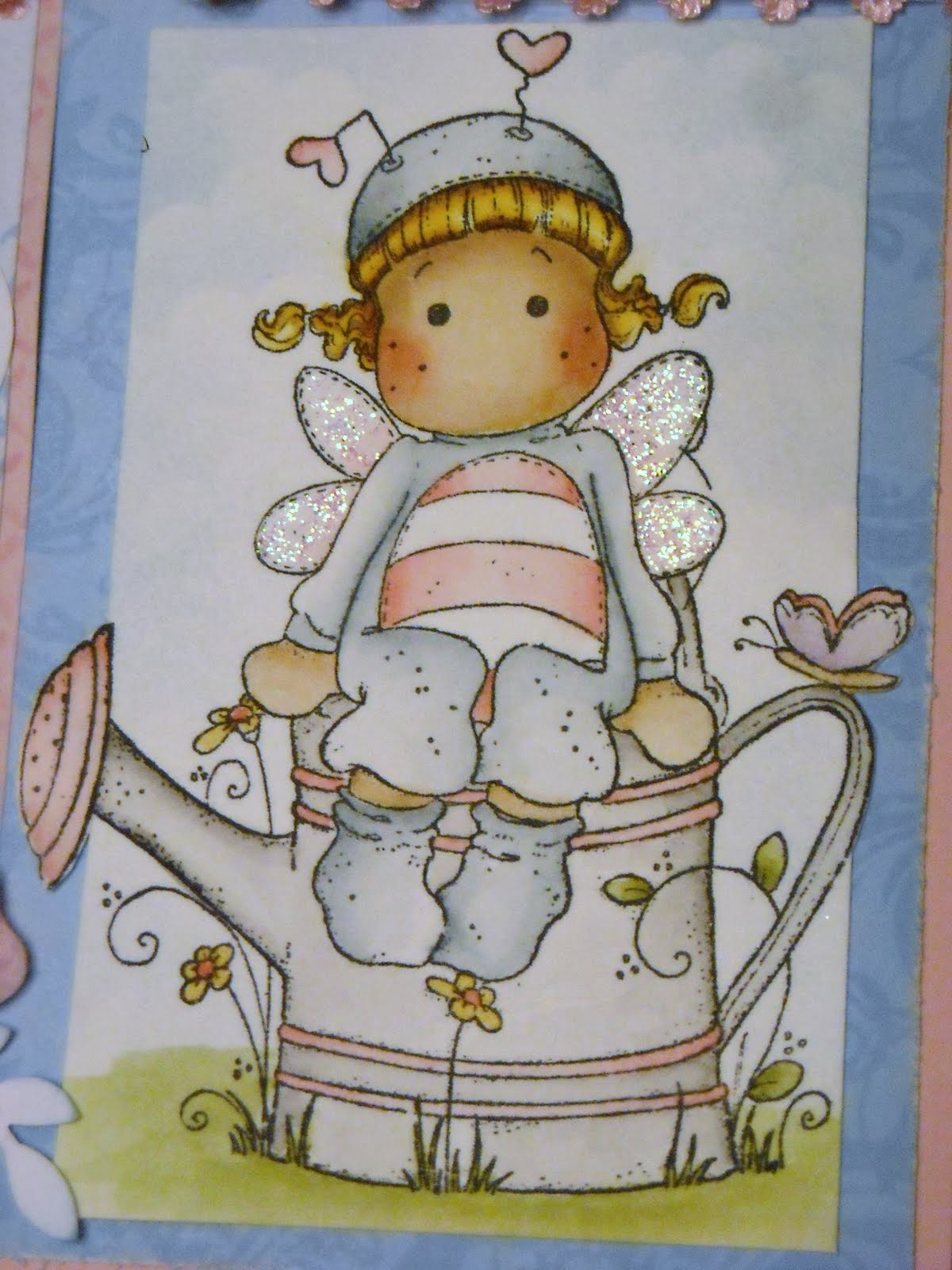 O this is beautiful! I love her sitting on the watering can and the soft patelly colours are stunning